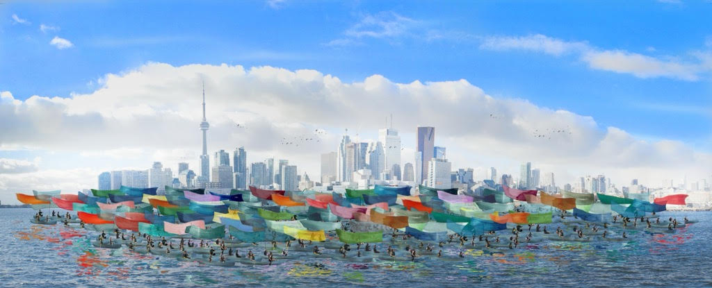 A procession of over one hundred canoes moves in unison across Toronto’s eastern Waterfront on September 27/28, each carrying colour field paintings made with pigments sourced from the lake/shoreline and activated by the wind.